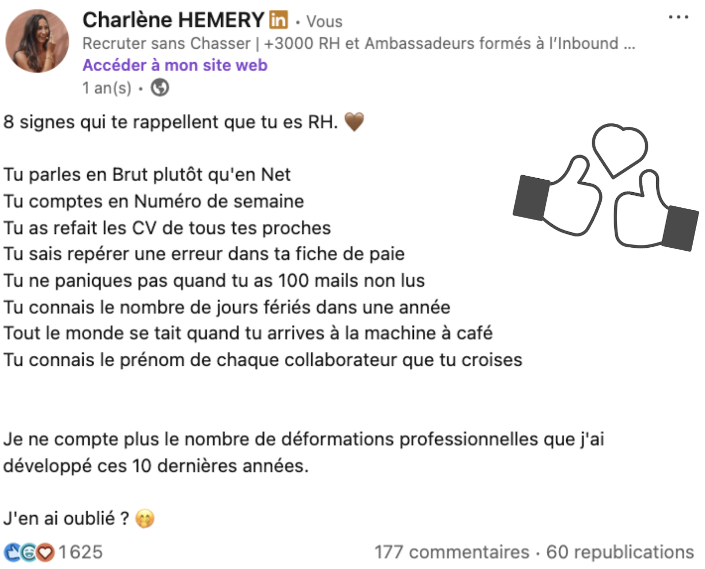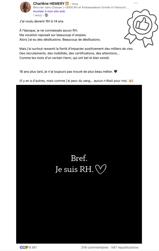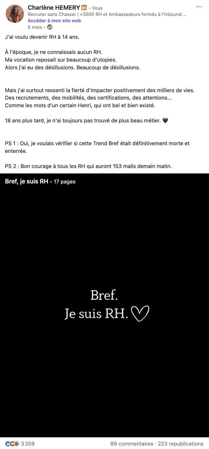 - Il permettait à de nombreux RH de s’y reconnaître. C’est ça qui a créé l’engagement : pas la trend elle-même, mais l’identification. Les gens se sont vus dans mon parcours et ont liké (pour envoyer des messages), commenté (pour taguer des collègues RH), partagé en public et en privé…
