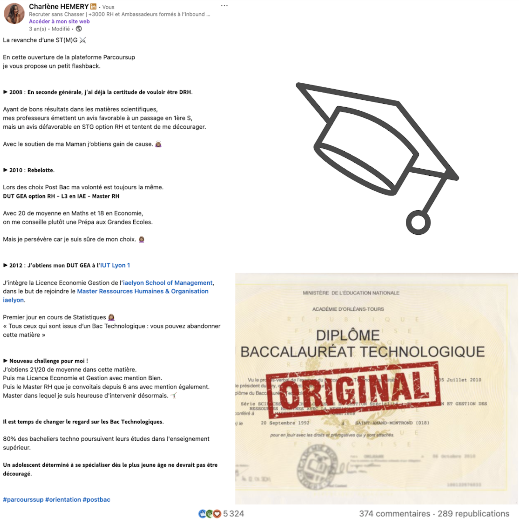 - Un message universel. Au-delà des RH ou des bacs technologiques, ce post parle de conviction. De savoir ce qu’on veut, malgré les avis contraires. Ça résonne avec énormément de parcours.