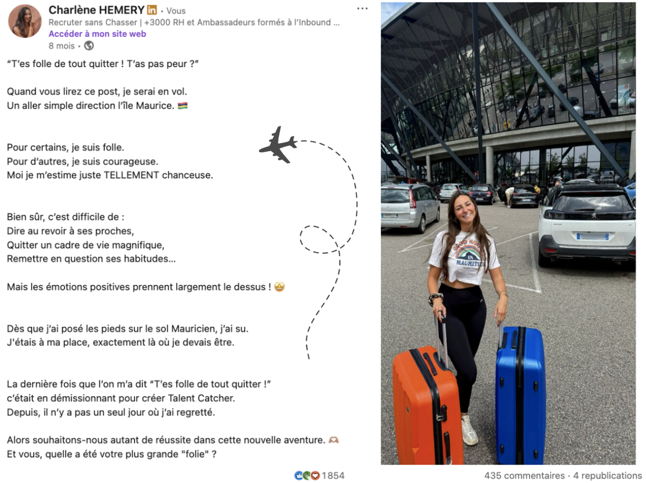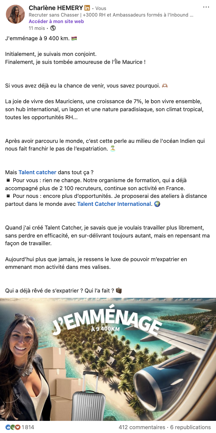 - Ça explique mes choix. Ce post donne du sens à mon parcours : pourquoi j’ai démissionné à 29 ans, pourquoi je vis à Maurice, pourquoi je ne reporte rien. Ça renforce la cohérence de mon personal branding et ça permet aux lecteurs de mieux me connaître.