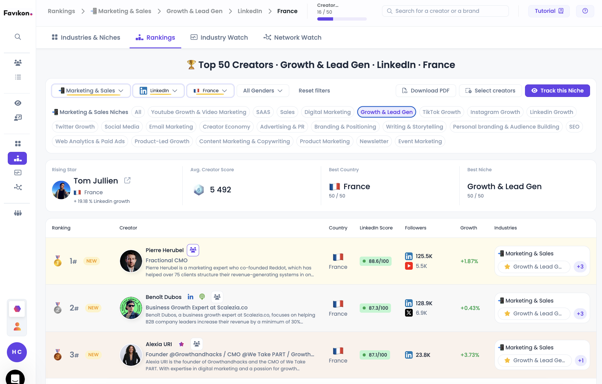 Si vous utilisez la Licence Business de Favikon, vous pouvez d’ailleurs identifier les créateurs les plus actifs sur une niche, par réseau social et par pays.