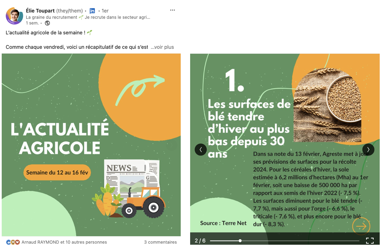 Si un contenu technique vous a plu, il y a de grandes chances que cela intéressent vos candidats. J’adore l’exemple d’Elie qui publie tous les vendredis la veille de son secteur pour attirer des professionnels Agricoles et Viticoles… futurs candidats. 😉