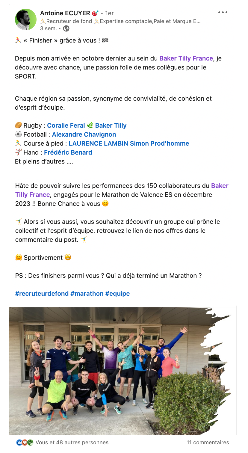 – Livrez-vous. Les candidats (et clients si vous êtes en cabinet) ne veulent pas interagir avec une “machine à recruter”, mais avec une personne humaine. Partager vos réflexions, votre parcours et vos centres d’intérêt permet d’instaurer une relation plus naturelle.