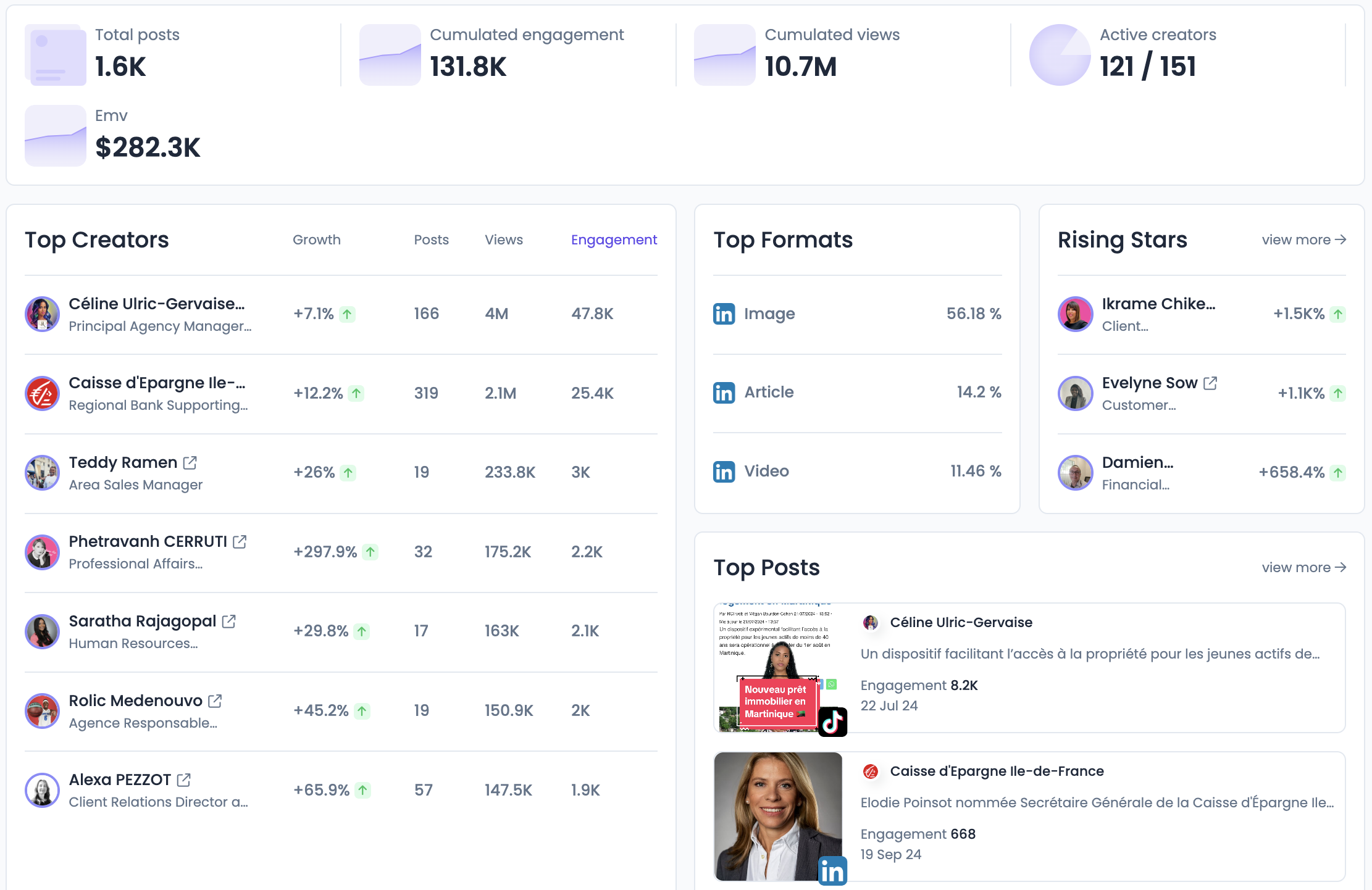 Le nombre de posts et les tops posts, le nombre de vues et l’engagement cumulé, les formats les plus utilisés, les ambassadeurs qui se démarquent… De quoi animer et challenger les équipes.