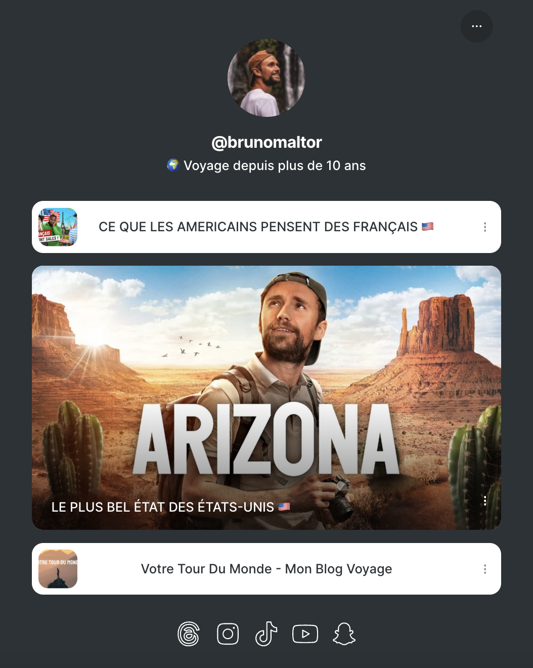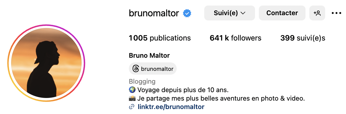 Dans sa biographie Instagram, Bruno Maltor renvoit vers son Linktr.ee où vous retrouverez : ses profils Threads, Tiktok, Youtube, Snapchat.