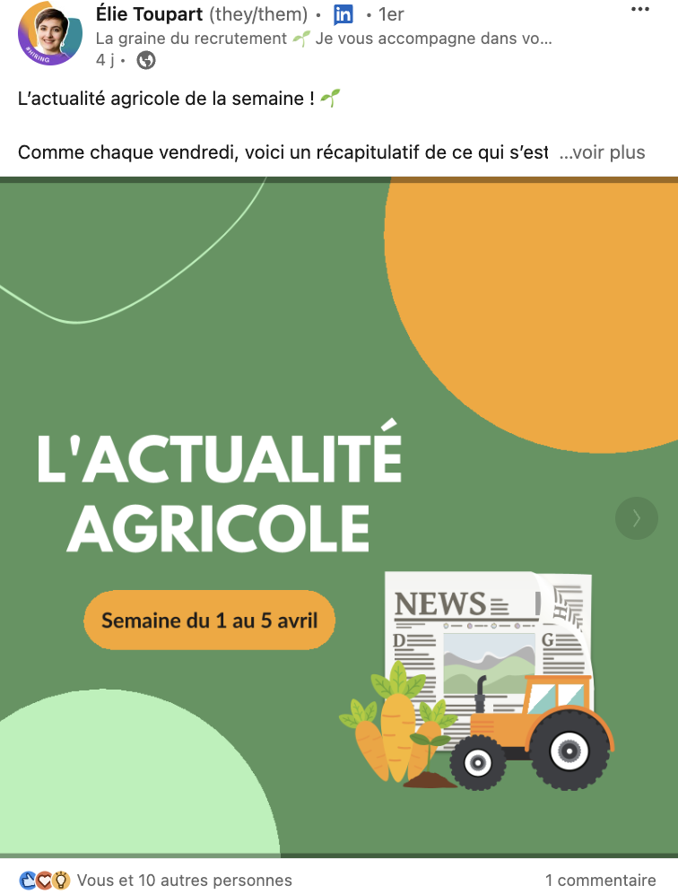 Comme Elie qui diffuse chaque Vendredi un carrousel qui compile toutes les actualités de la semaine dans le secteur Agricole – Viticole (comme elle est spécialisée sur les recrutements de ce secteur).
