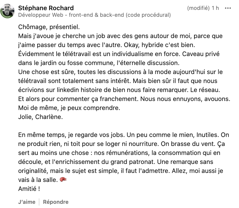 Comme partagé ci-dessus, le télétravail est un sujet qui engage : admirateur comme détracteur. La viralité implique plus de commentaires négatifs. Il est extrêmement rare que j’en ai sur LinkedIn mais le Remote attise l’animosité… et je l’entends.