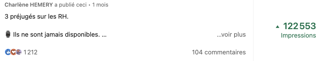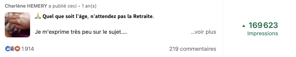 La thématique était d’actualité (lors de la réforme des retraites) et touche une audience plus large que ma cible. C’est un véritable post TOFU (je vous explique tout sur la stratégie TOFU – MOFU – BOFU juste ici)